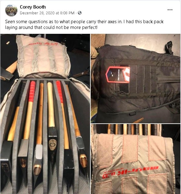 You hands, a pelican gun case, modified guitar case, laptop bag, backpack, pretty much anything with a handle will do. No matter what you use, the blade should always be covered to prevent damage or injury if something goes wrong and most venues require covers when not throwing. You can buy sheaths, covers, and holsters from several people within the group. There are a number of threads within the Sport of Axe Throwing Group that a search of “carry”, “carrying”, or “case” should result in half a dozen responses, all with Vin saying “UsE tHe SeArCh BaR!” Our two favorite designs are Corey Booth’s backpack and Adam Buckley’s guitar case.